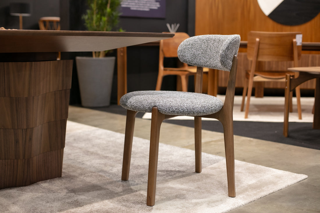 A Cadeira Franchesca é a materialização do detalhe como protagonista. Sua arquitetura distingue-se pelo refinamento do espaldar, que incorpora um trabalho de marcenaria preciso – frequentemente apresentando um detalhe em madeira exposta (puxador ou moldura) no verso – criando um ponto focal visualmente rico mesmo quando a peça está recolhida sob a mesa. O design equilibra a robustez do volume estofado com a elegância de pés levemente angulados, conferindo uma postura estática de nobreza e equilíbrio.