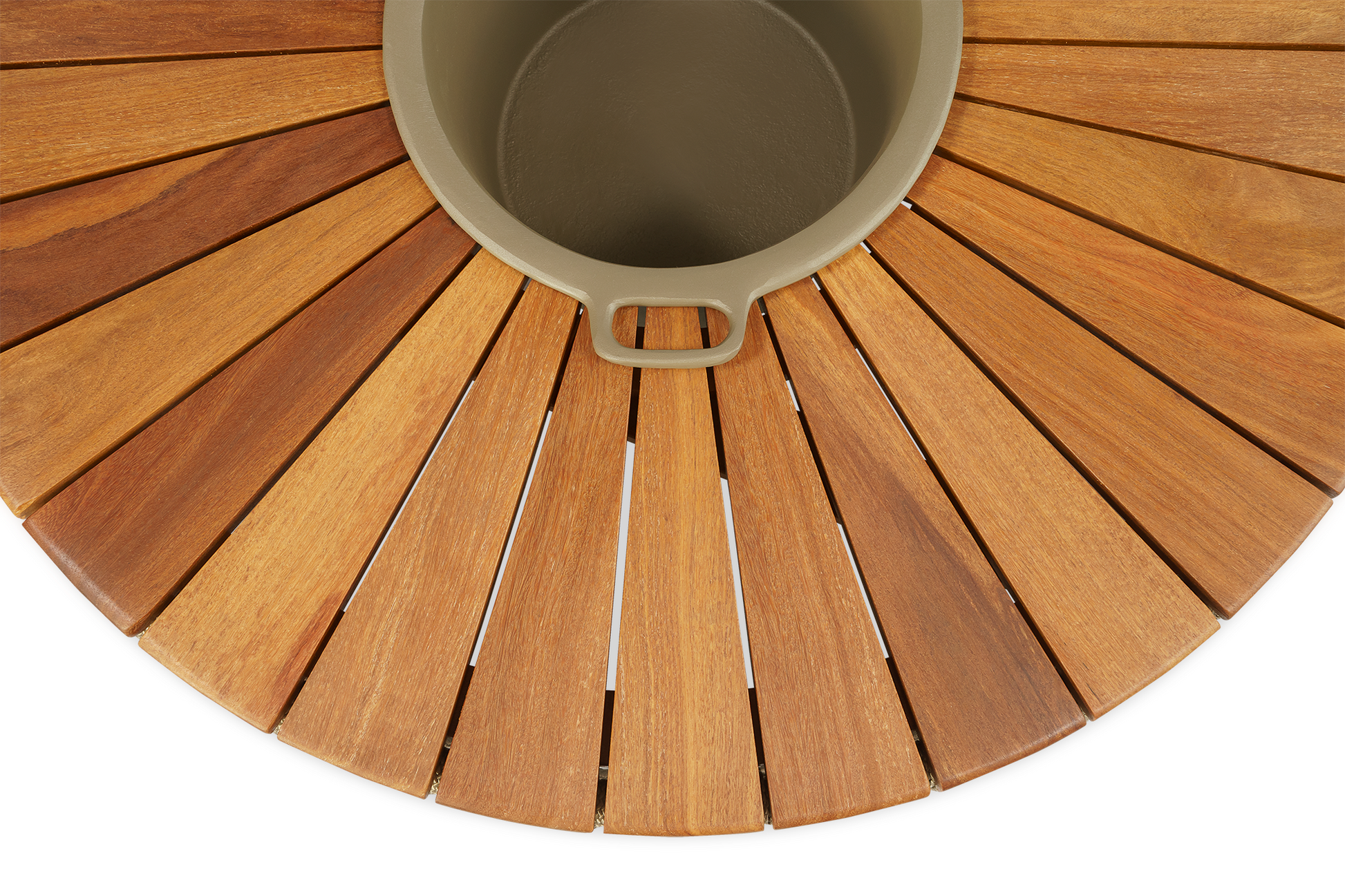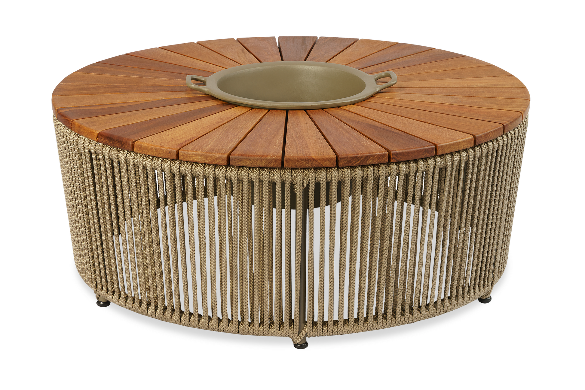 Mesa De Centro Gold 100cm Com Champanheira Tampo Ripado Formato Pizza Em Madeira Maciça Peroba-Rosa Base de Alumínio e Corda Náutica