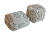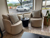 Este projeto de interiores revela um ambiente de estar moderno e sofisticado, que equilibra o conforto dos estofados claros com a elegância de detalhes em preto e dourado. A paleta de cores é predominantemente neutra, criando uma base clean e versátil.O mobiliário foi cuidadosamente selecionado para criar um espaço funcional e visualmente interessante: um amplosofá koob em tecido cinza claro domina a área de estar, oferecendo assentos espaçosos e convidativos. Duas poltronas harmony estofadas em veludo cinza, com design arredondado e contemporâneo, agregam um toque de luxo e conforto extra. Em primeiro plano, um par de pufes handmade apresenta uma estampa geométrica ousada em preto e branco, adicionando um elemento gráfico e moderno ao ambiente. Uma mesa de centro de tampo preto com base metálica dourada serve como ponto focal, complementada por objetos decorativos minimalistas. A composição é finalizada com plantas naturais em vasos de fibra, que trazem vida e frescor, e uma luminária de piso preta com múltiplas cúpulas, que adiciona personalidade à iluminação geral. O uso de um grande espelho de chão com moldura preta e um espelho menor com moldura de palha na lateral esquerda são usados para ampliar visualmente o espaço e refletir a luz, uma técnica comum para ambientes elegantes.