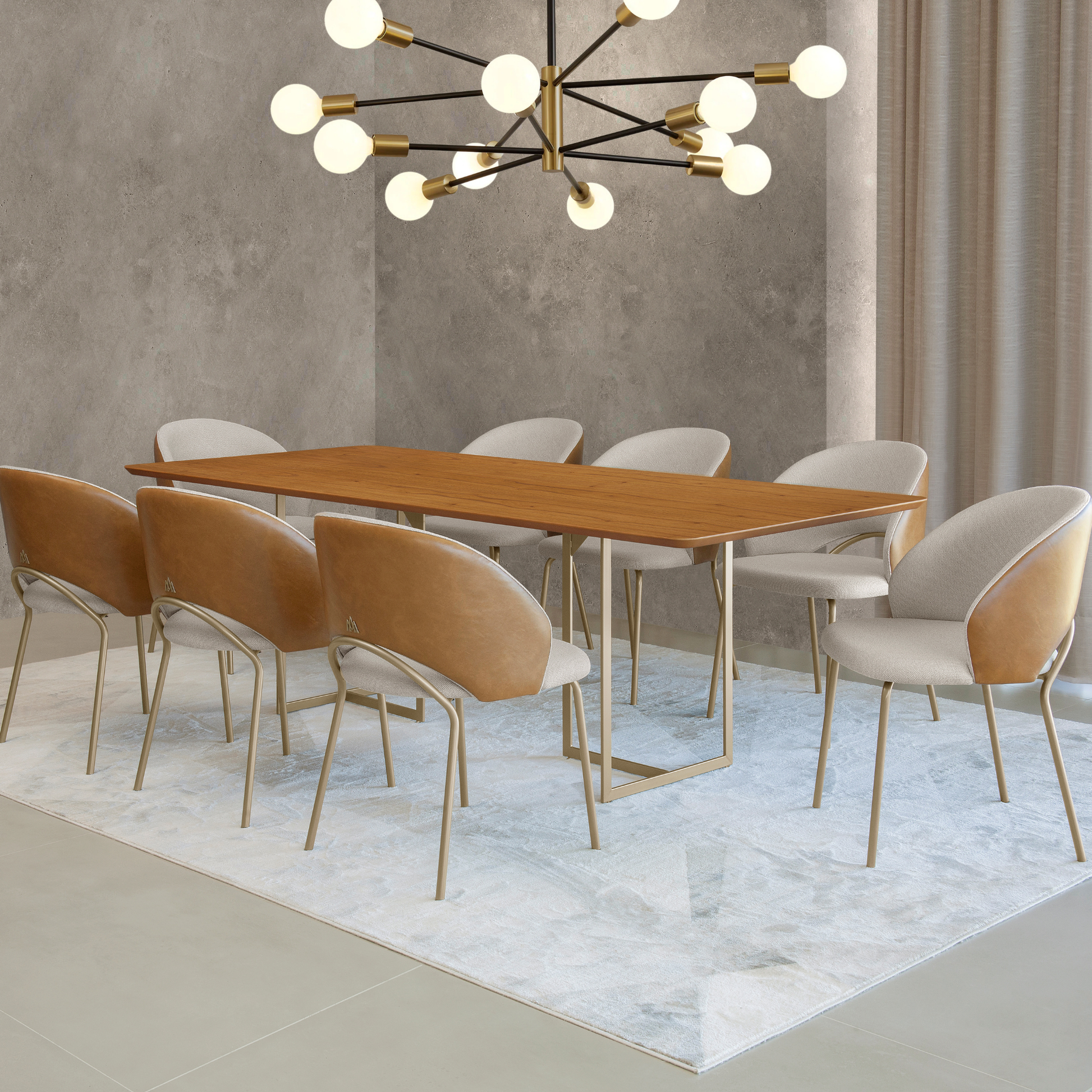 No design de interiores, a Belagio é a personificação perfeita do quiet luxury. Como as costas da cadeira são a parte mais visível quando posicionadas ao redor da mesa, o acabamento externo em couro com o sutil detalhe da marca transforma o móvel em um ponto de sofisticação no ambiente. Sua mistura equilibrada de materiais (metal frio, couro liso e tecido texturizado) a torna extremamente versátil, dialogando lindamente tanto com mesas de jantar em lâmina de madeira natural quanto com tampos em pedra fina ou mármore.