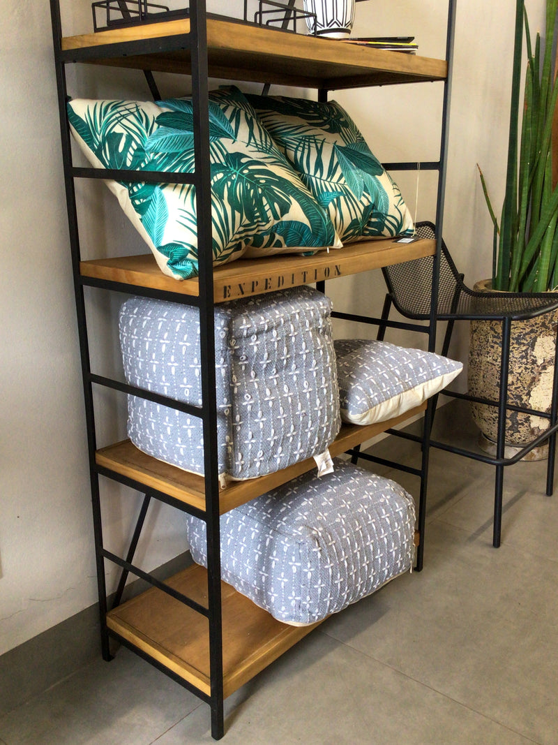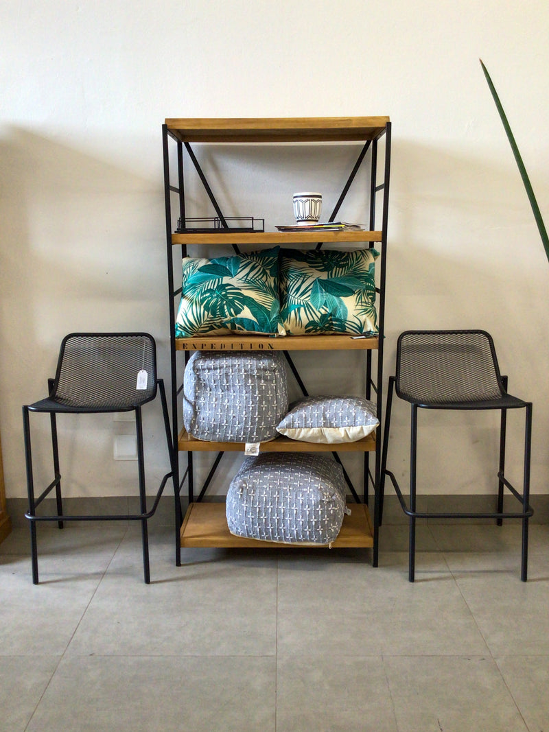 Librería con 4 estantes negros con madera.