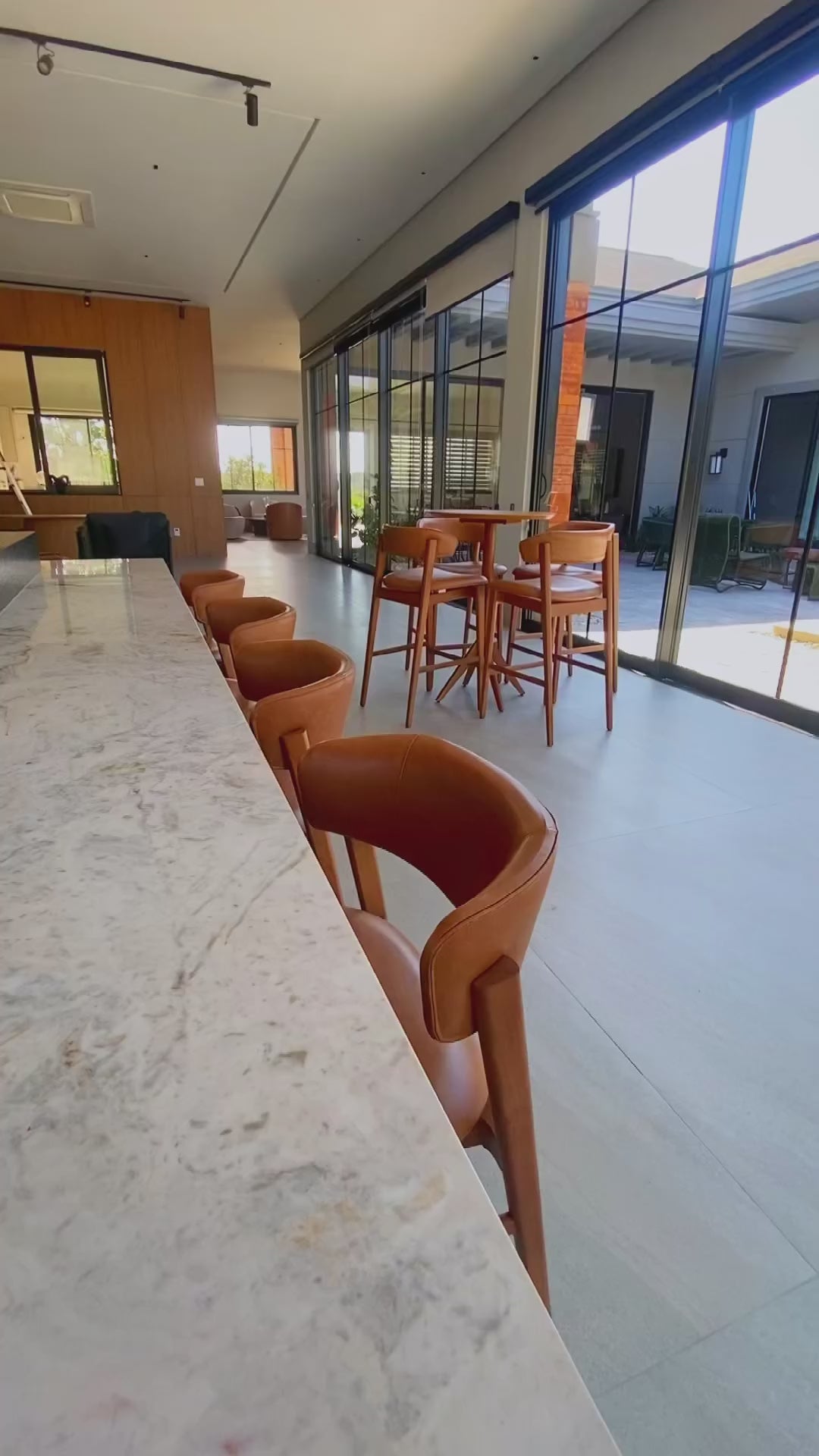 A Banqueta Dior é a expressão do equilíbrio entre o design de abraço e a leveza visual. Sua arquitetura é definida pelo encosto em forma de meia-lua ("C" profundo) que flutua sobre a estrutura, sustentado apenas pelas hastes laterais de madeira. Esse desenho cria um "respiro" visual entre o assento e o encosto, permitindo que a luz atravesse a peça e evitando que o ambiente fique visualmente carregado, mesmo quando várias unidades estão alinhadas na bancada.