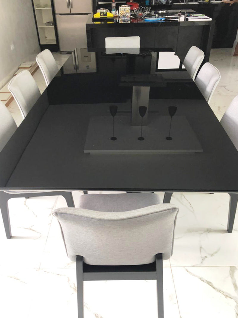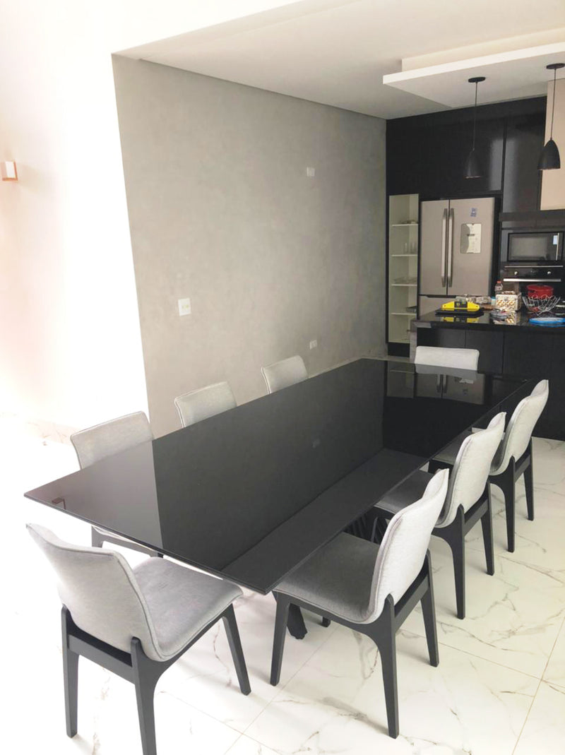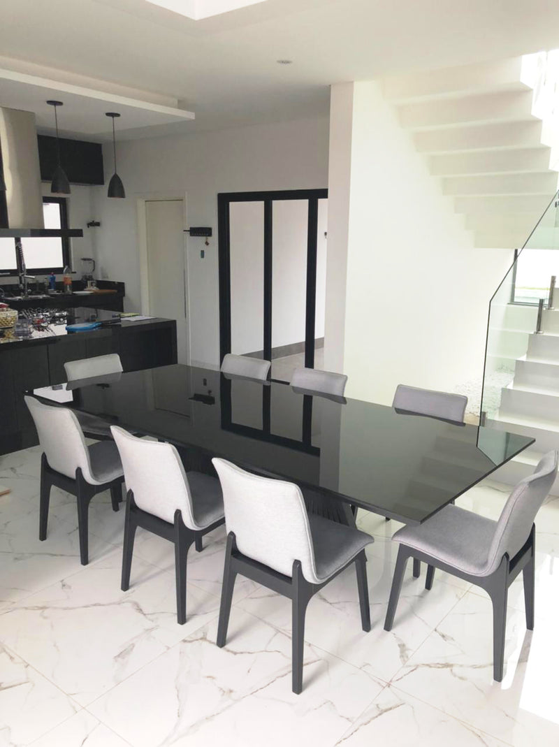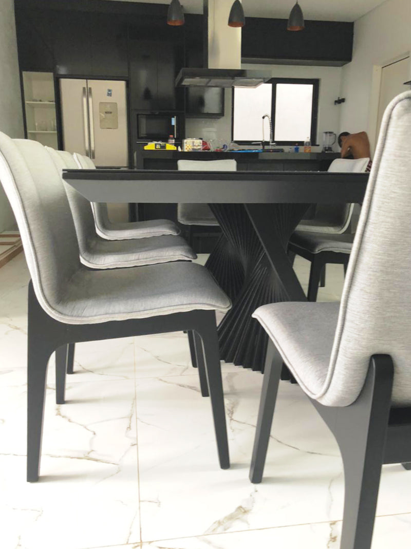 Cadeira Donna Madeira cor Preta Assento Estofado Linho Cinza
