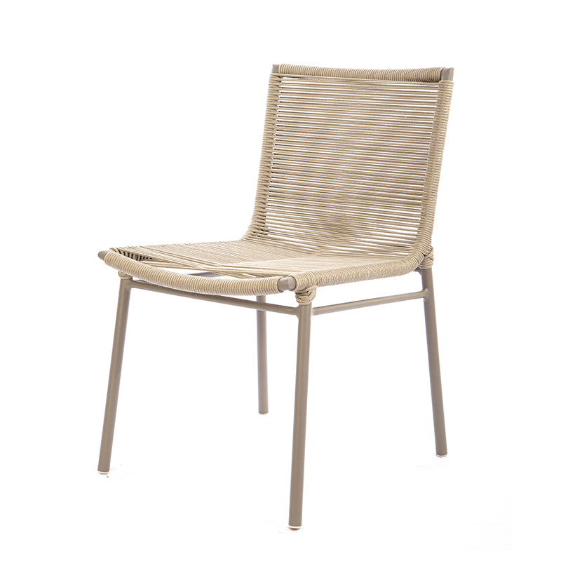 A estrutura é manufaturada em alumínio tubular de alta resistência com acabamento em pintura eletrostática, imune à oxidação. O assento e encosto são tecidos manualmente, permitindo a escolha entre a corda náutica, de estética linear e firme, ou o tricô náutico, que oferece um toque macio e aveludado. Ambos os materiais possuem proteção UV para suportar exposição solar contínua sem perder a cor.