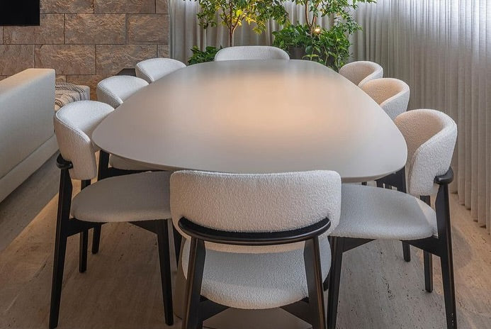 Sua vocação é o conforto versátil. A Monic é uma cadeira que transita com elegância entre a sala de jantar e o home office; seu design de "abraço" e dimensões equilibradas (aprox. 53cm de largura) a tornam ideal para otimizar espaços sem perder a imponência. Ela harmoniza magnificamente ao redor de mesas redondas ou ovais, onde suas curvas acompanham o fluxo do tampo, ou em composições com mesas de madeira natural, criando um ambiente acolhedor e visualmente leve.