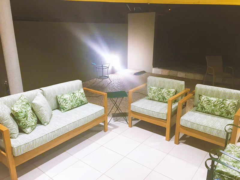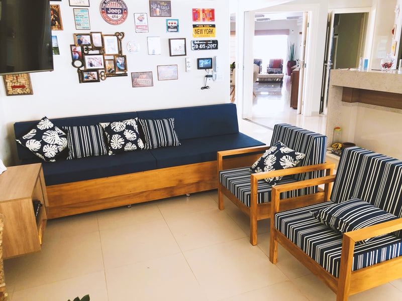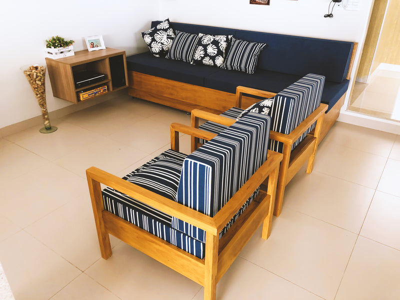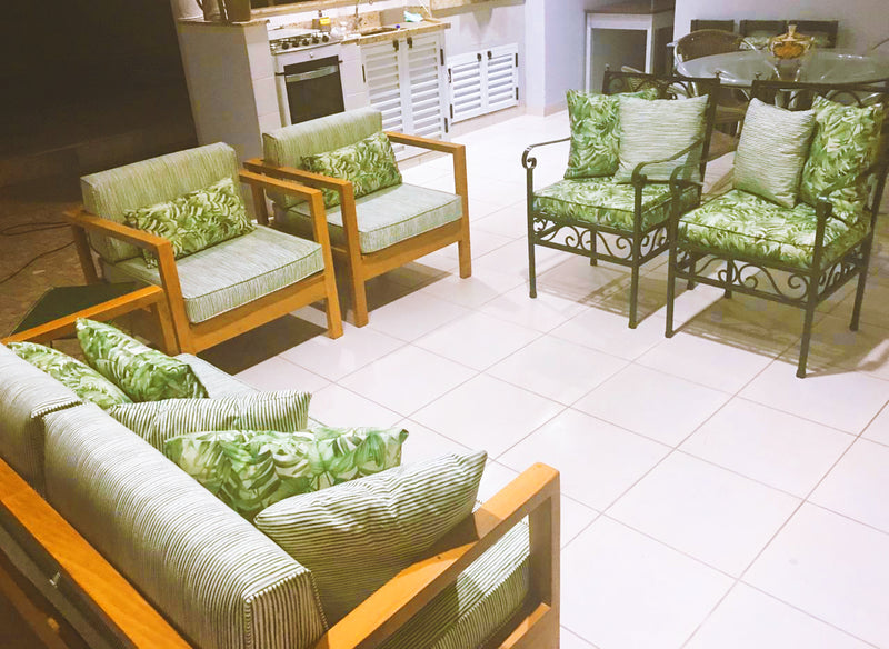 Projetado para configurar espaços de convívio, o conjunto assume o protagonismo em varandas amplas, jardins de inverno e áreas gourmet. Sua materialidade crua permite composições de alto contraste em ambientes contemporâneos, ou uma integração orgânica em cenários externos cobertos, servindo como ponto de ancoragem visual e social.