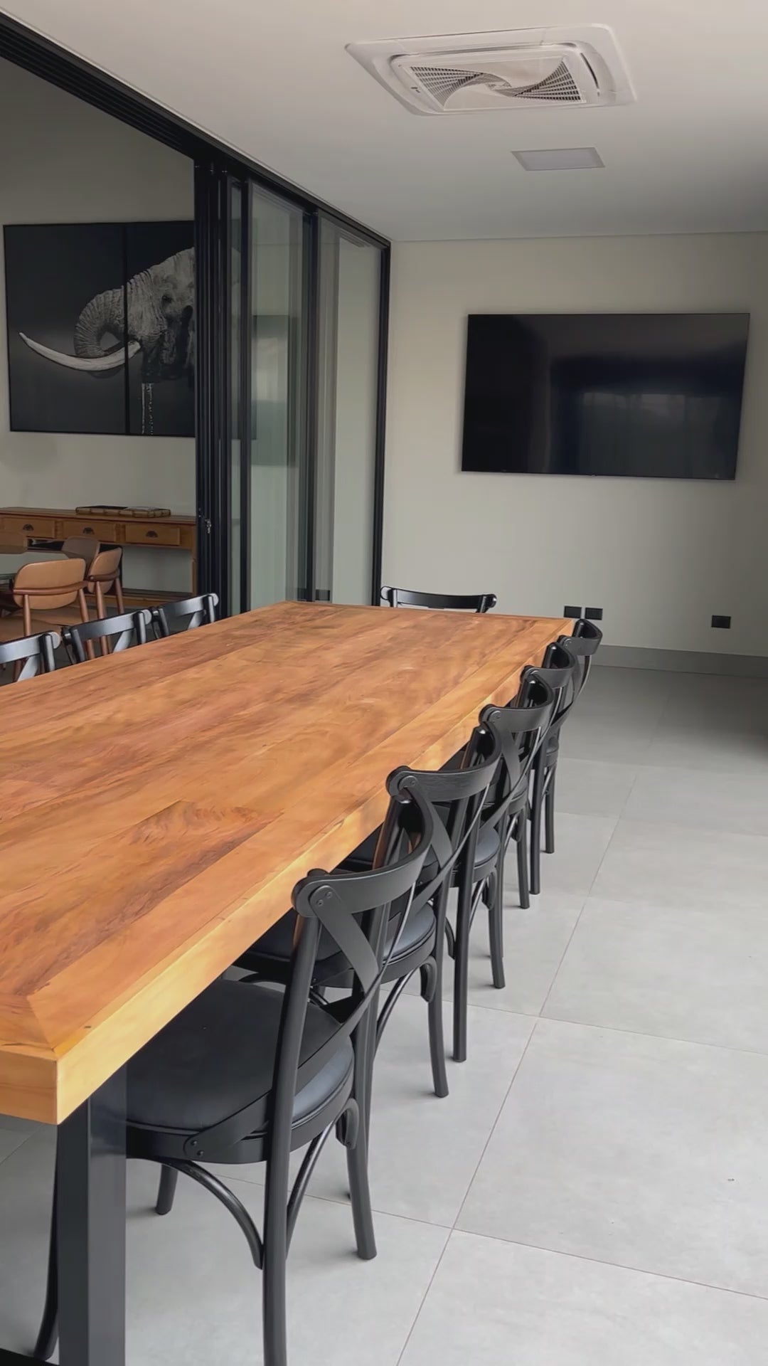 Ideal para ancorar ambientes de fluxo intenso, a mesa transita com naturalidade entre salas de jantar internas e áreas gourmet ou varandas cobertas. Sua materialidade mista permite composições sofisticadas, harmonizando tanto com o rigor do concreto aparente quanto com o conforto de cadeiras em tecido ou corda náutica.