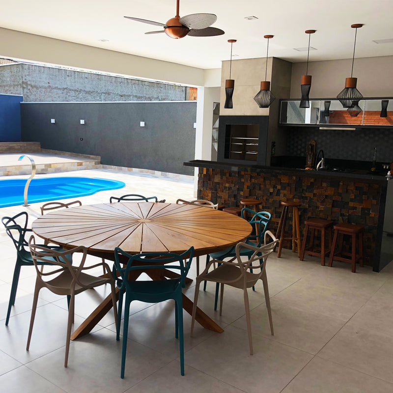 Projetada para ancorar espaços de convívio, a peça atua como ponto focal em salas de jantar, áreas gourmet ou varandas cobertas. Sua estética rústica e sofisticada permite criar composições de alto contraste, dialogando com cadeiras de design moderno em metal ou couro, equilibrando calor natural e rigor arquitetônico.