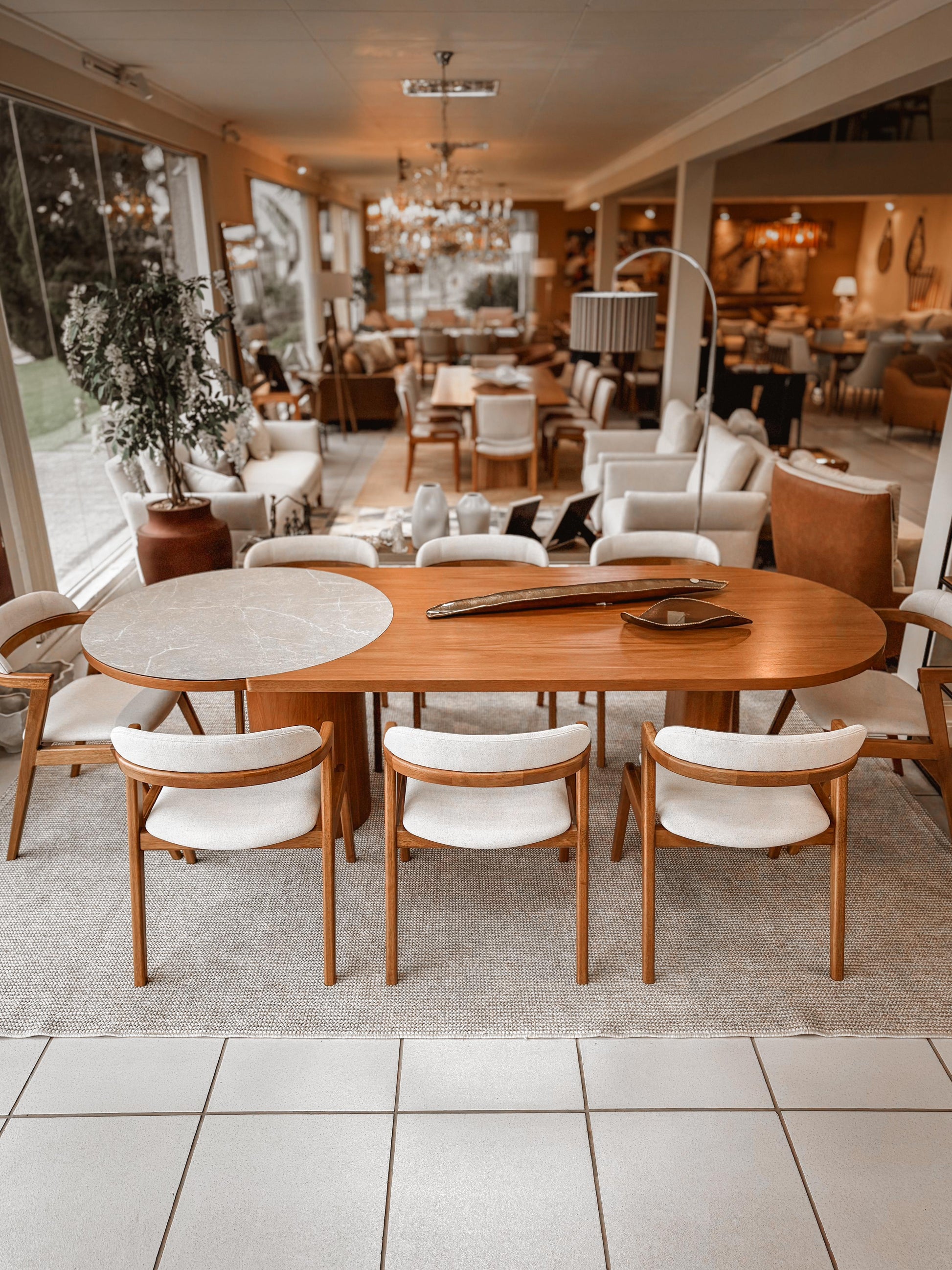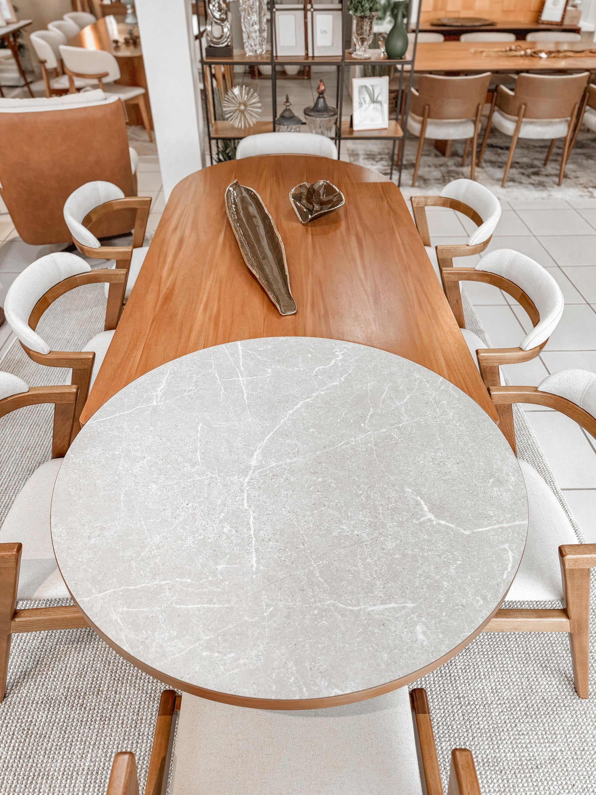 Estruturalmente, a Selena é uma aula de proporção e equilíbrio, ancorada por bases sólidas que incluem um elegante pedestal cilíndrico de madeira sustentando a seção circular, conferindo estabilidade e fluidez para a circulação das pernas. Alinhada ao conceito de quiet luxury, ela é a protagonista absoluta de salas de jantar contemporâneas e amplas. Funciona como o palco perfeito para composições com cadeiras de design curvilíneo e tecidos em tons claros, entregando um cenário de elegância atemporal, pronto para receber com maestria e arrancar suspiros.