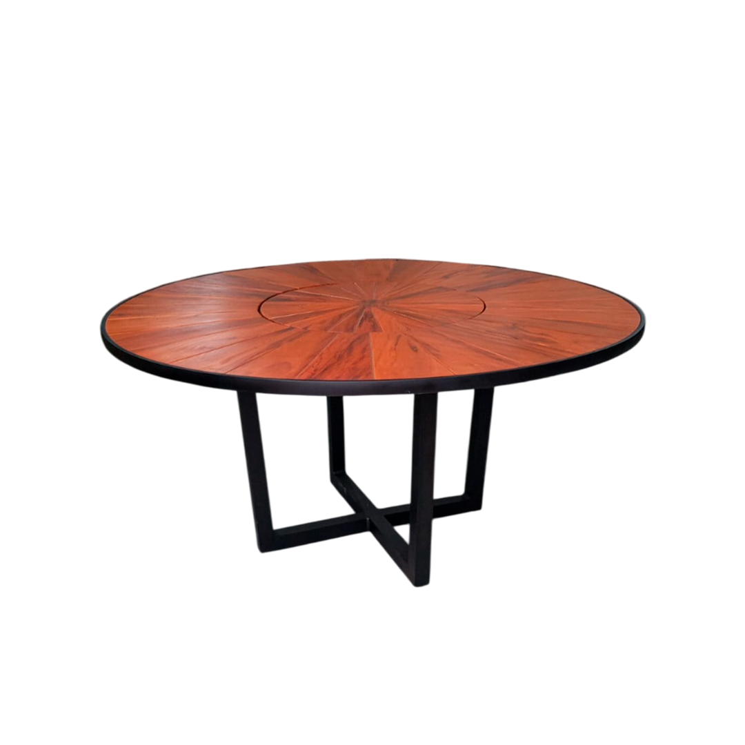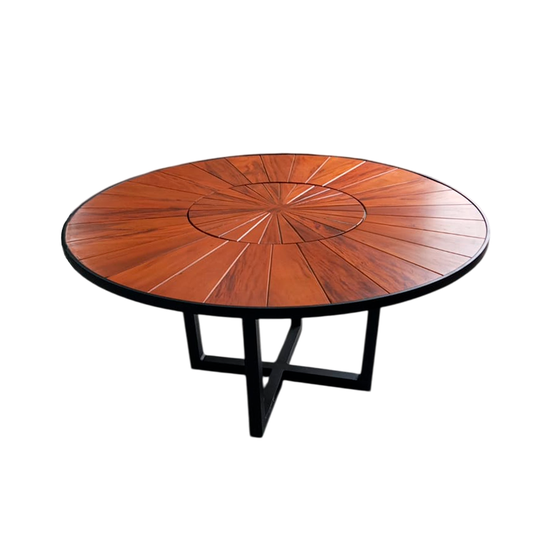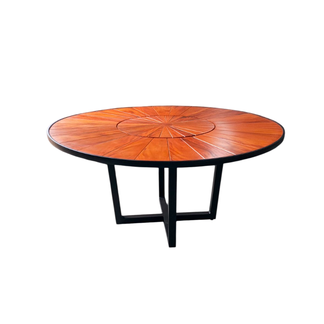 Mesa Redonda 160cm Tampo Ripado Pizza Madeira Maciça Peroba-rosa com Prato Giratório 70cm Base Montreal Alumínio Cor Preta