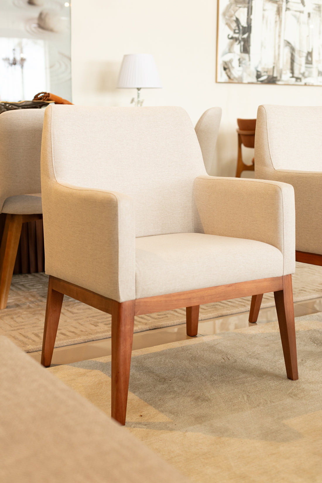Devido ao seu perfil híbrido (o conforto de uma poltrona com a altura de uma cadeira), a Sarah é a escolha estratégica para Cabeceiras de Mesa de Jantar. Ela confere hierarquia e imponência às pontas da mesa, mas também funciona magnificamente como poltrona de aproximação em livings compactos ou quartos, onde o espaço é precioso mas o conforto não pode ser negociado.
