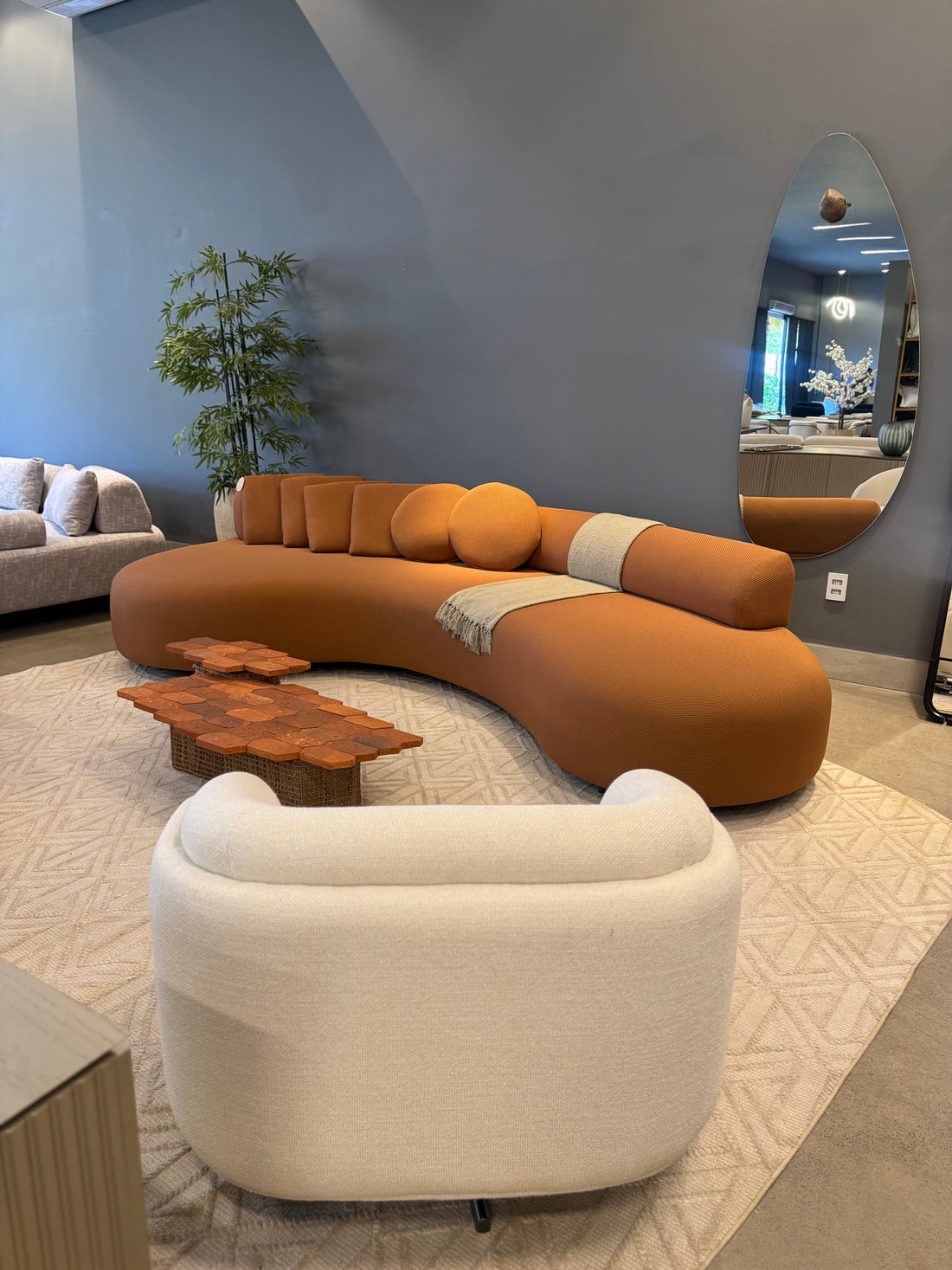 A construção interna utiliza espumas de alta densidade e tecnologia de memória, garantindo que a estrutura mantenha sua forma original e suporte ao longo dos anos. O acabamento é o protagonista tátil: o Bouclé adiciona textura tridimensional e calor; o Linho proporciona frescor e sofisticação natural; e o Couro entrega nobreza e durabilidade, desenvolvendo uma pátina única que valoriza a peça com o tempo.